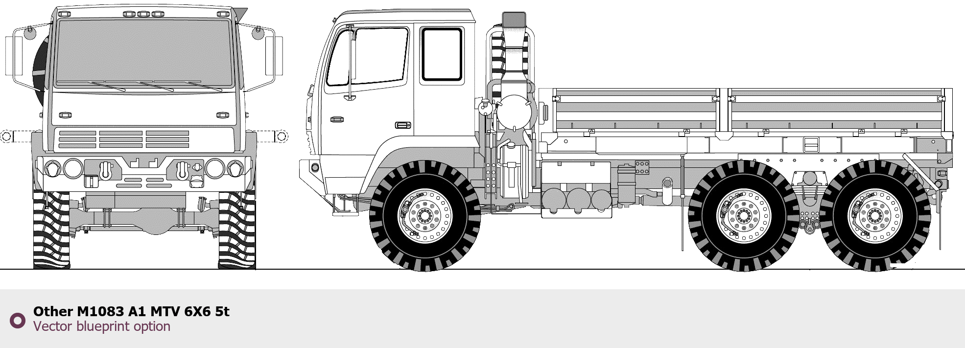 Raster blueprint of the Other M1083 A1 MTV 6X6 5t Heavy Truck. This free downloadable image can be used for graphic projects, digital design, and 3D modeling. The file provides accurate exterior proportions of the vehicle. Body type: Heavy Truck.