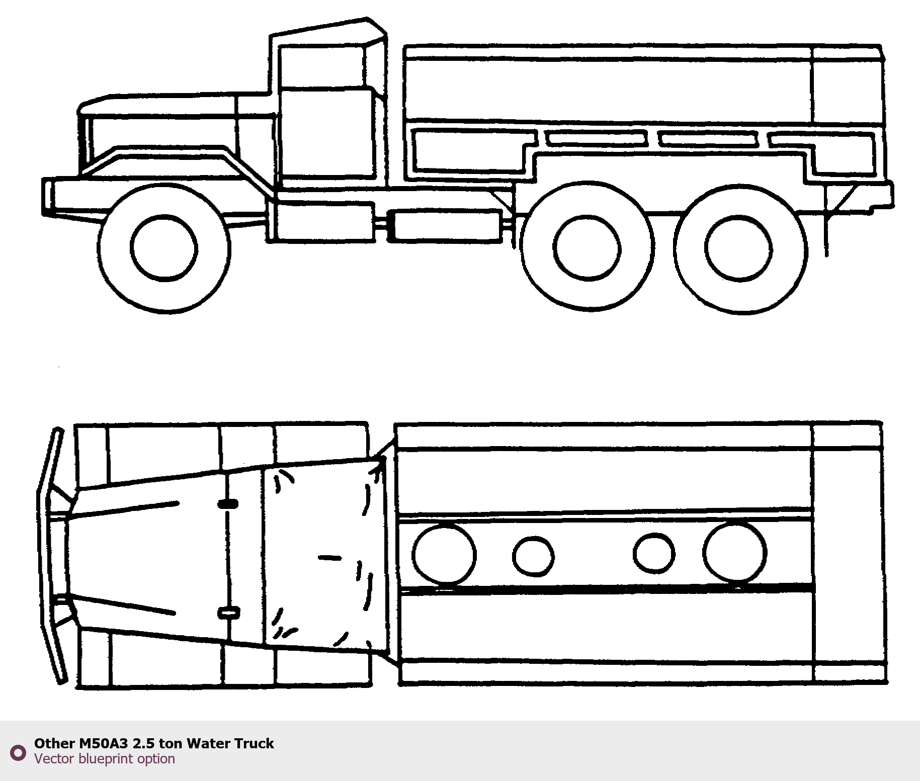 Raster blueprint of the Other M50A3 2.5 ton Water Truck Heavy Truck. This free downloadable image can be used for graphic projects, digital design, and 3D modeling. The file provides accurate exterior proportions of the vehicle. Body type: Heavy Truck.