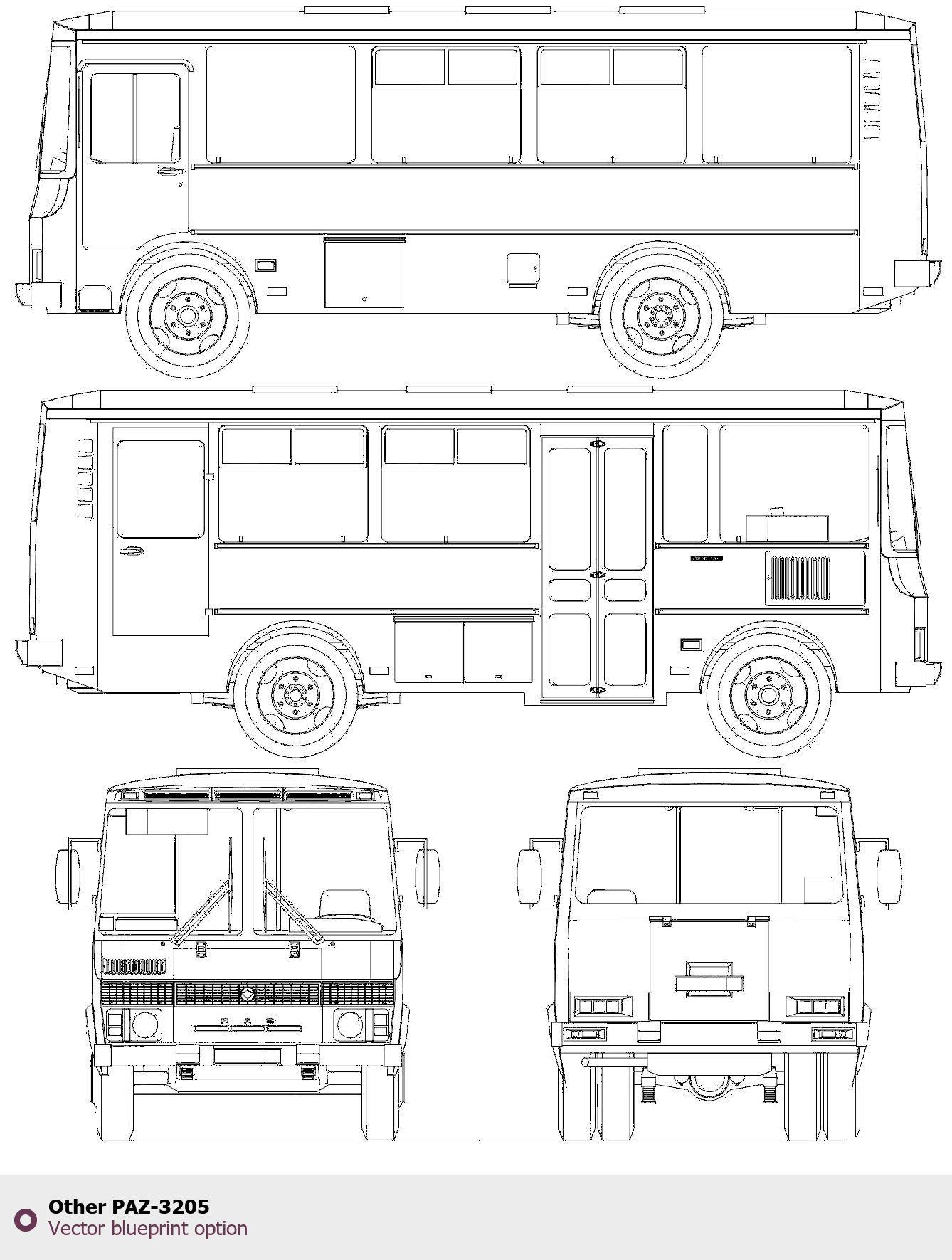 Raster blueprint of the Other PAZ-3205 Bus. This free downloadable image can be used for graphic projects, digital design, and 3D modeling. The file provides accurate exterior proportions of the vehicle. Body type: Bus.