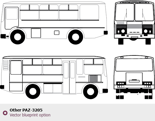 Raster blueprint of the Other PAZ-3205 Bus. This free downloadable image can be used for graphic projects, digital design, and 3D modeling. The file provides accurate exterior proportions of the vehicle. Body type: Bus.