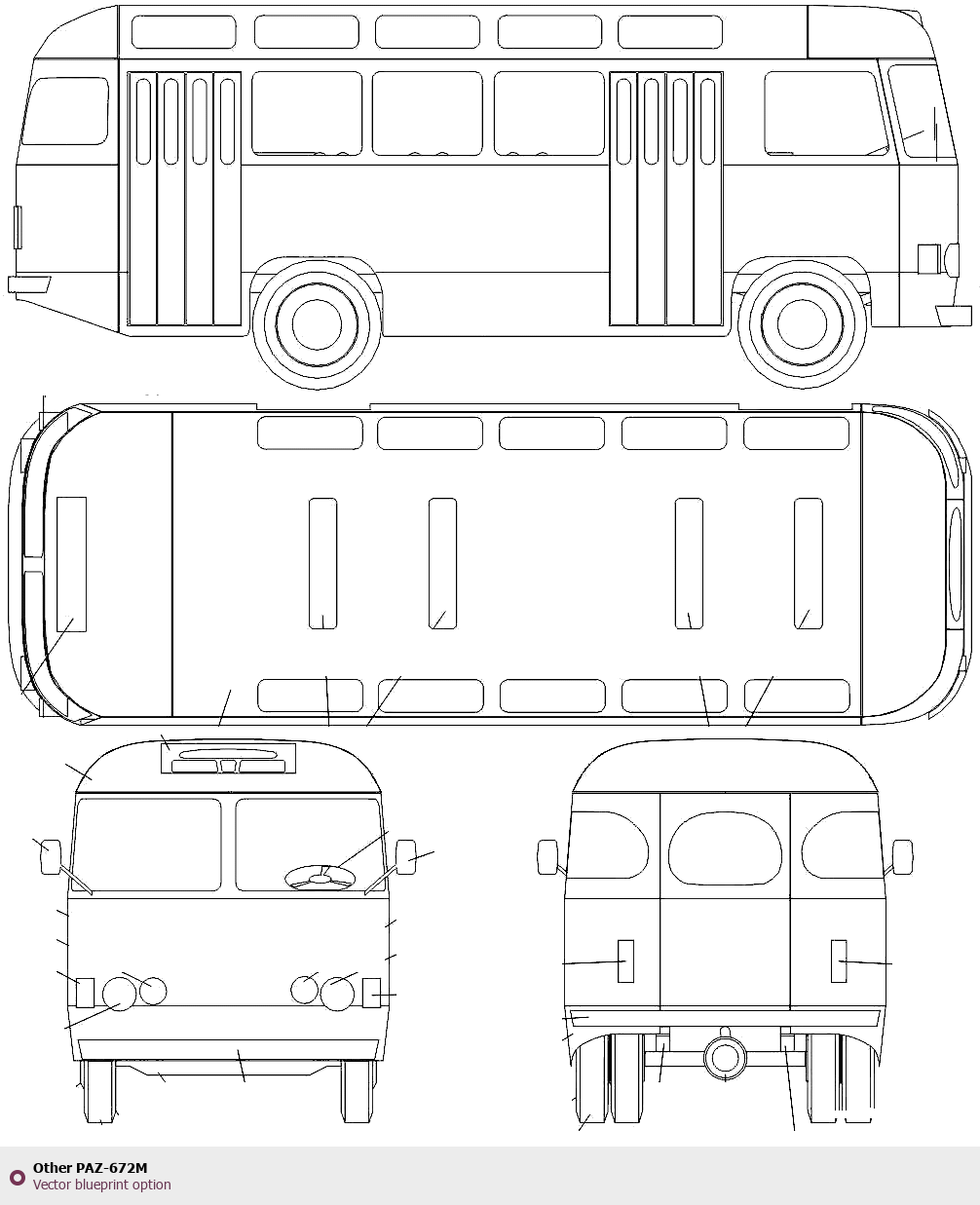 Raster blueprint of the Other PAZ-672M Bus. This free downloadable image can be used for graphic projects, digital design, and 3D modeling. The file provides accurate exterior proportions of the vehicle. Body type: Bus.