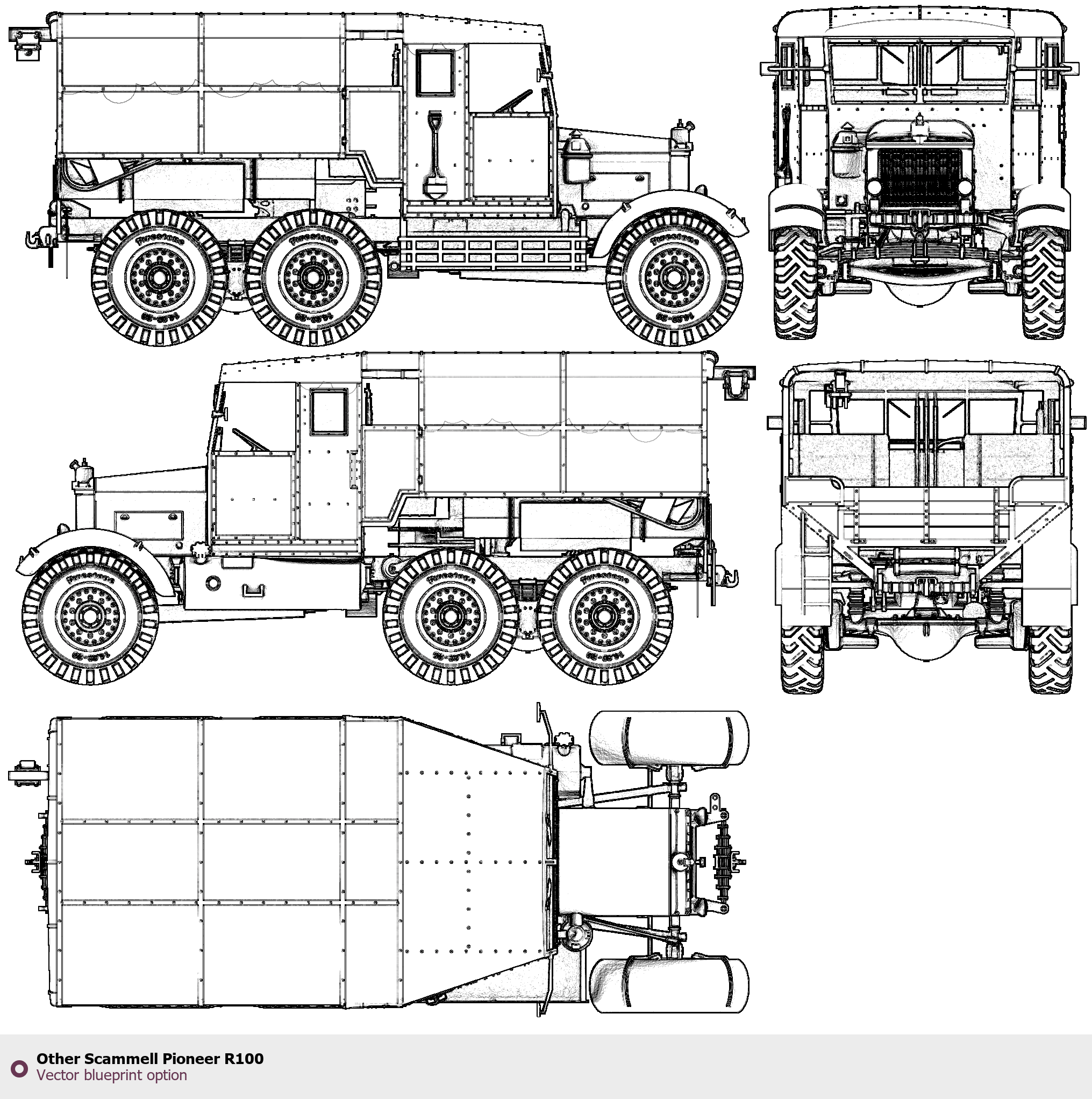 Raster blueprint of the Other Scammell Pioneer R100 Heavy Truck. This free downloadable image can be used for graphic projects, digital design, and 3D modeling. The file provides accurate exterior proportions of the vehicle. Body type: Heavy Truck.