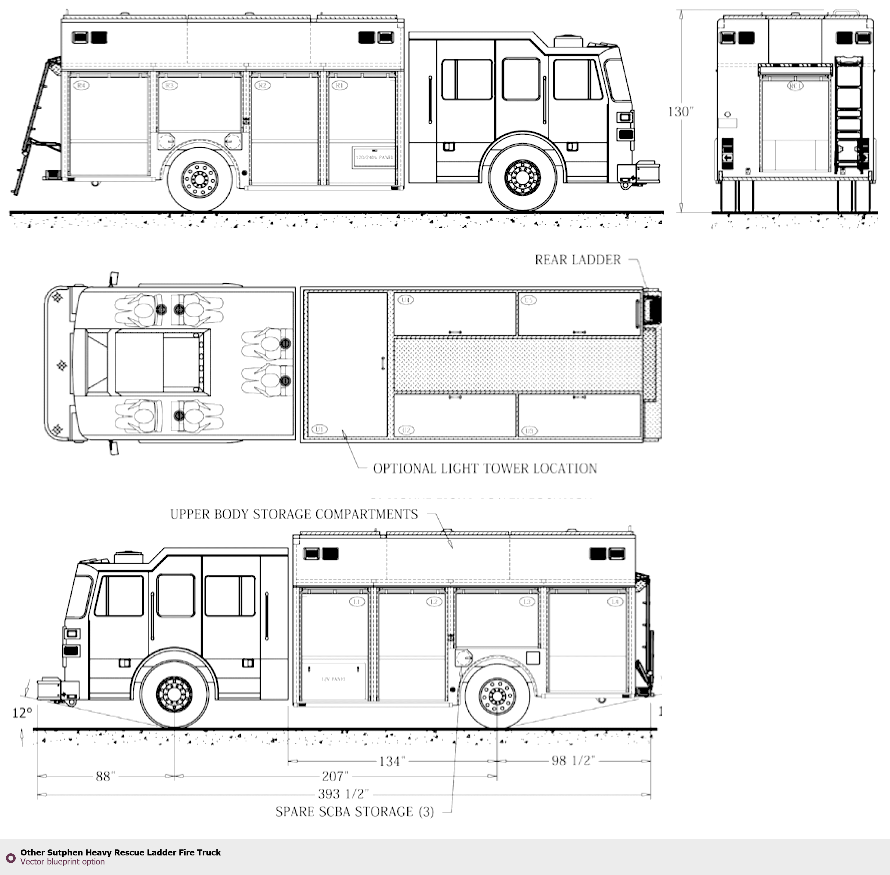 Raster blueprint of the Other Sutphen Heavy Rescue Ladder Fire Truck Heavy Truck. This free downloadable image can be used for graphic projects, digital design, and 3D modeling. The file provides accurate exterior proportions of the vehicle. Body type: Heavy Truck.