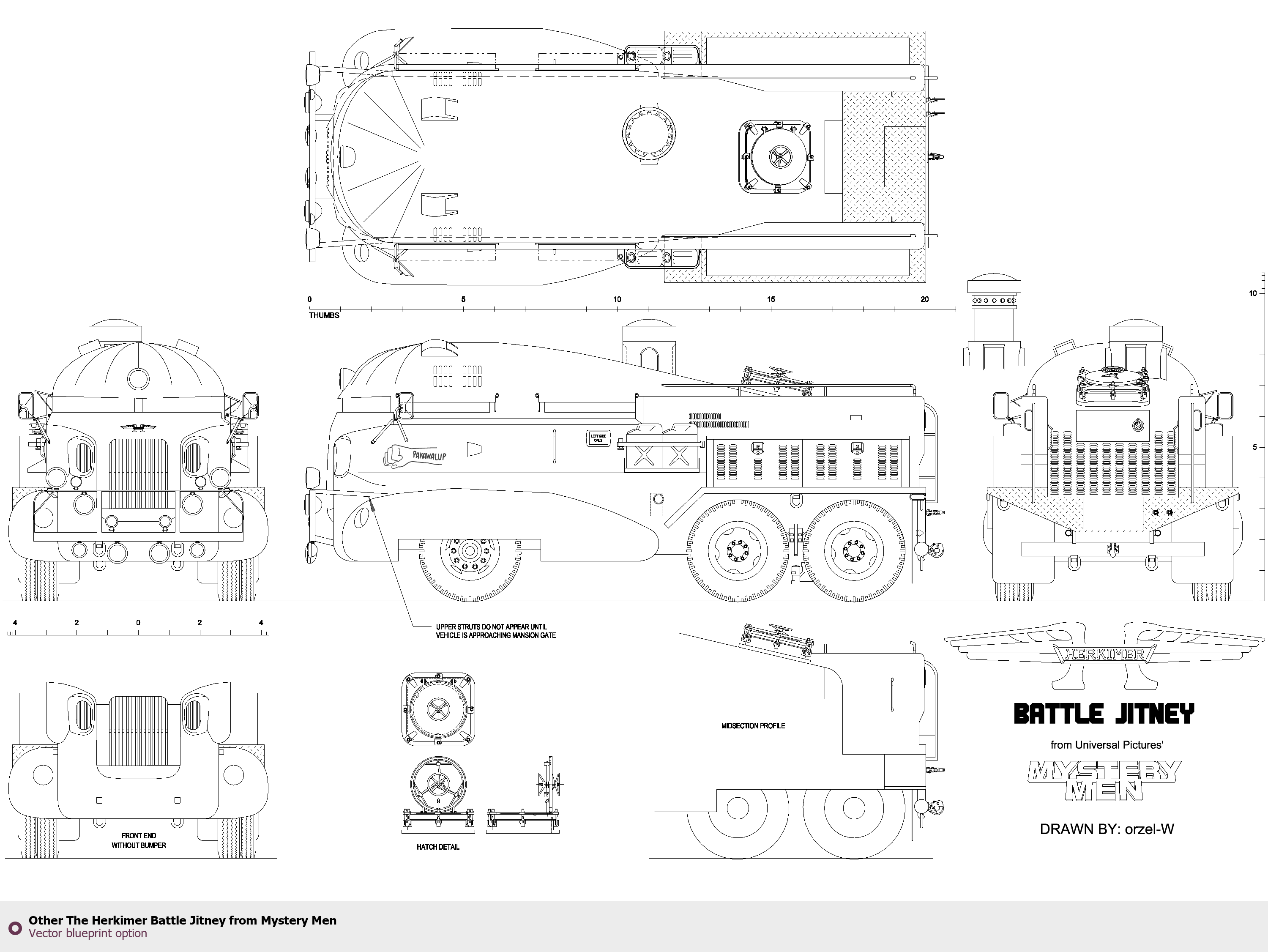 Raster blueprint of the Other The Herkimer Battle Jitney from Mystery Men Heavy Truck. This free downloadable image can be used for graphic projects, digital design, and 3D modeling. The file provides accurate exterior proportions of the vehicle. Body type: Heavy Truck.