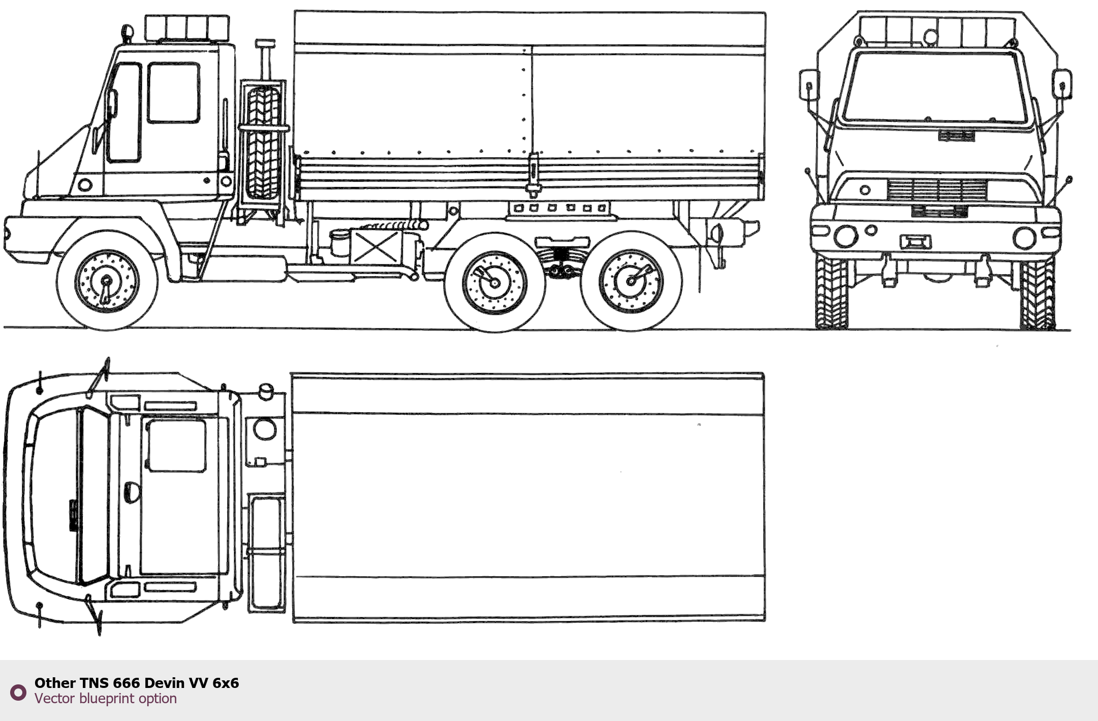 Raster blueprint of the Other TNS 666 Devin VV 6x6 Heavy Truck. This free downloadable image can be used for graphic projects, digital design, and 3D modeling. The file provides accurate exterior proportions of the vehicle. Body type: Heavy Truck.