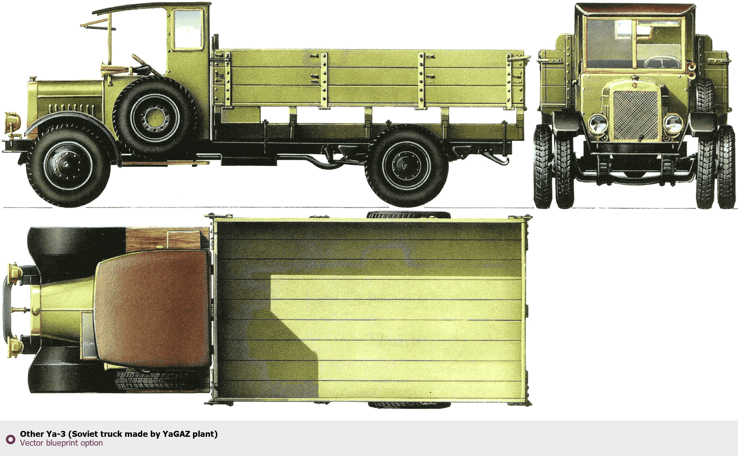 Raster blueprint of the Other Ya-3 (Soviet truck made by YaGAZ plant) Heavy Truck. This free downloadable image can be used for graphic projects, digital design, and 3D modeling. The file provides accurate exterior proportions of the vehicle. Body type: Heavy Truck.
