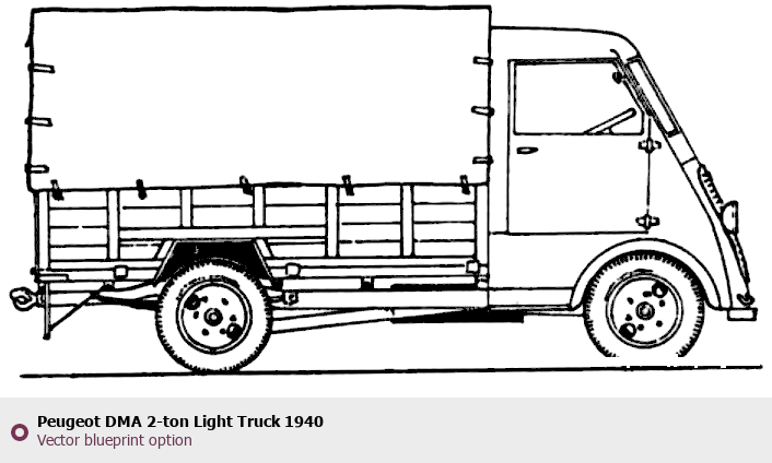 Raster blueprint of the 1940 Peugeot DMA 2-ton Light Truck Heavy Truck. This free downloadable image can be used for graphic projects, digital design, and 3D modeling. The file provides accurate exterior proportions of the vehicle. Model year: 1940. Body type: Heavy Truck.