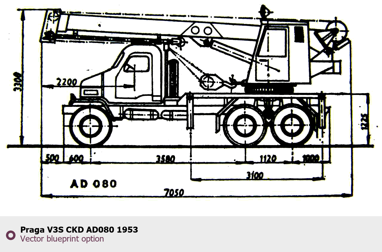 Raster blueprint of the 1953 Praga V3S CKD AD080 Heavy Truck. This free downloadable image can be used for graphic projects, digital design, and 3D modeling. The file provides accurate exterior proportions of the vehicle. Model year: 1953. Body type: Heavy Truck.