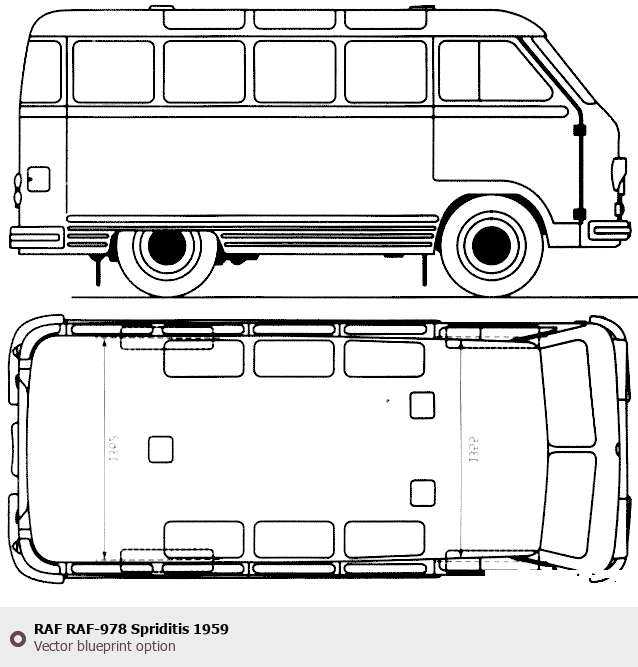 Raster blueprint of the 1959 RAF RAF-978 Spriditis Tag. This free downloadable image can be used for graphic projects, digital design, and 3D modeling. The file provides accurate exterior proportions of the vehicle. Model year: 1959. Body type: Tag.