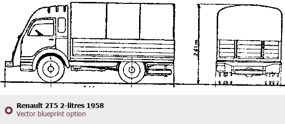 Raster blueprint of the 1958 Renault 2T5 2-litres Heavy Truck. This free downloadable image can be used for graphic projects, digital design, and 3D modeling. The file provides accurate exterior proportions of the vehicle. Model year: 1958. Body type: Heavy Truck.