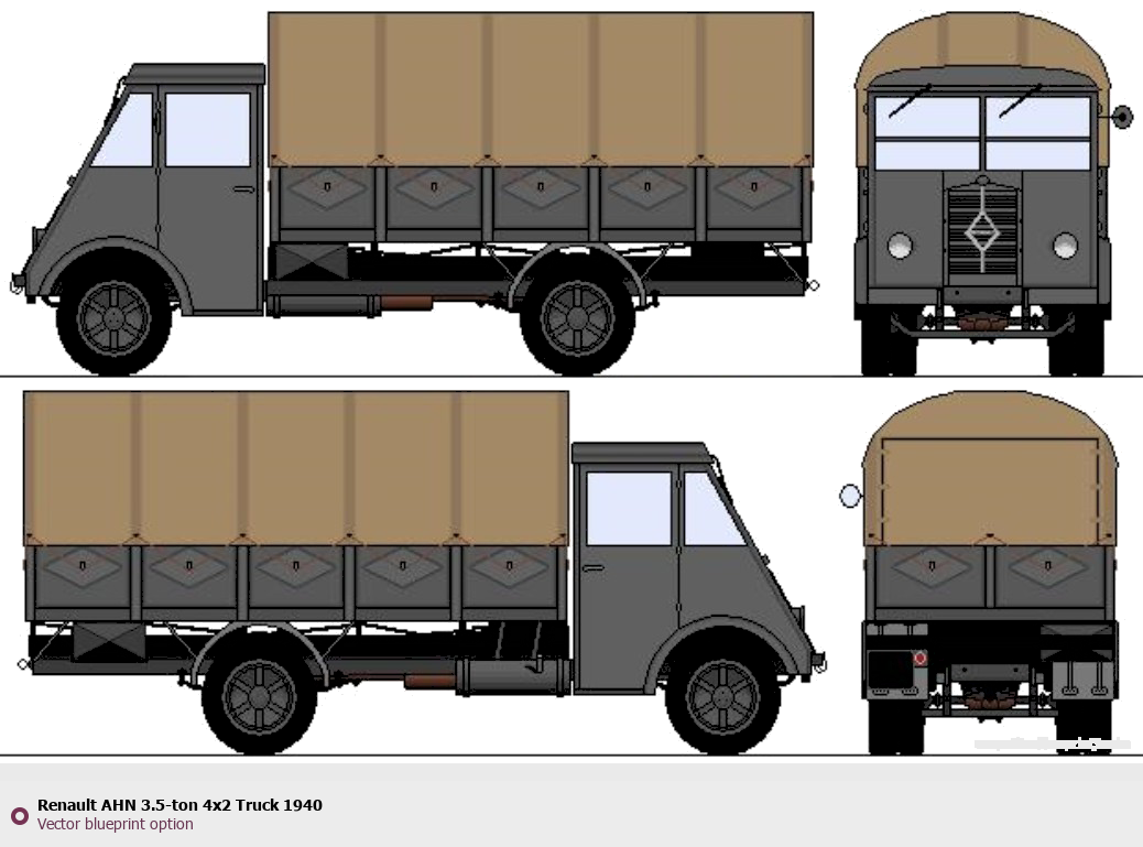 Raster blueprint of the 1940 Renault AHN 3.5-ton 4x2 Truck Heavy Truck. This free downloadable image can be used for graphic projects, digital design, and 3D modeling. The file provides accurate exterior proportions of the vehicle. Model year: 1940. Body type: Heavy Truck.