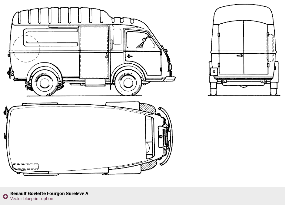Raster blueprint of the Renault Goelette Fourgon Sureleve A Heavy Truck. This free downloadable image can be used for graphic projects, digital design, and 3D modeling. The file provides accurate exterior proportions of the vehicle. Body type: Heavy Truck.