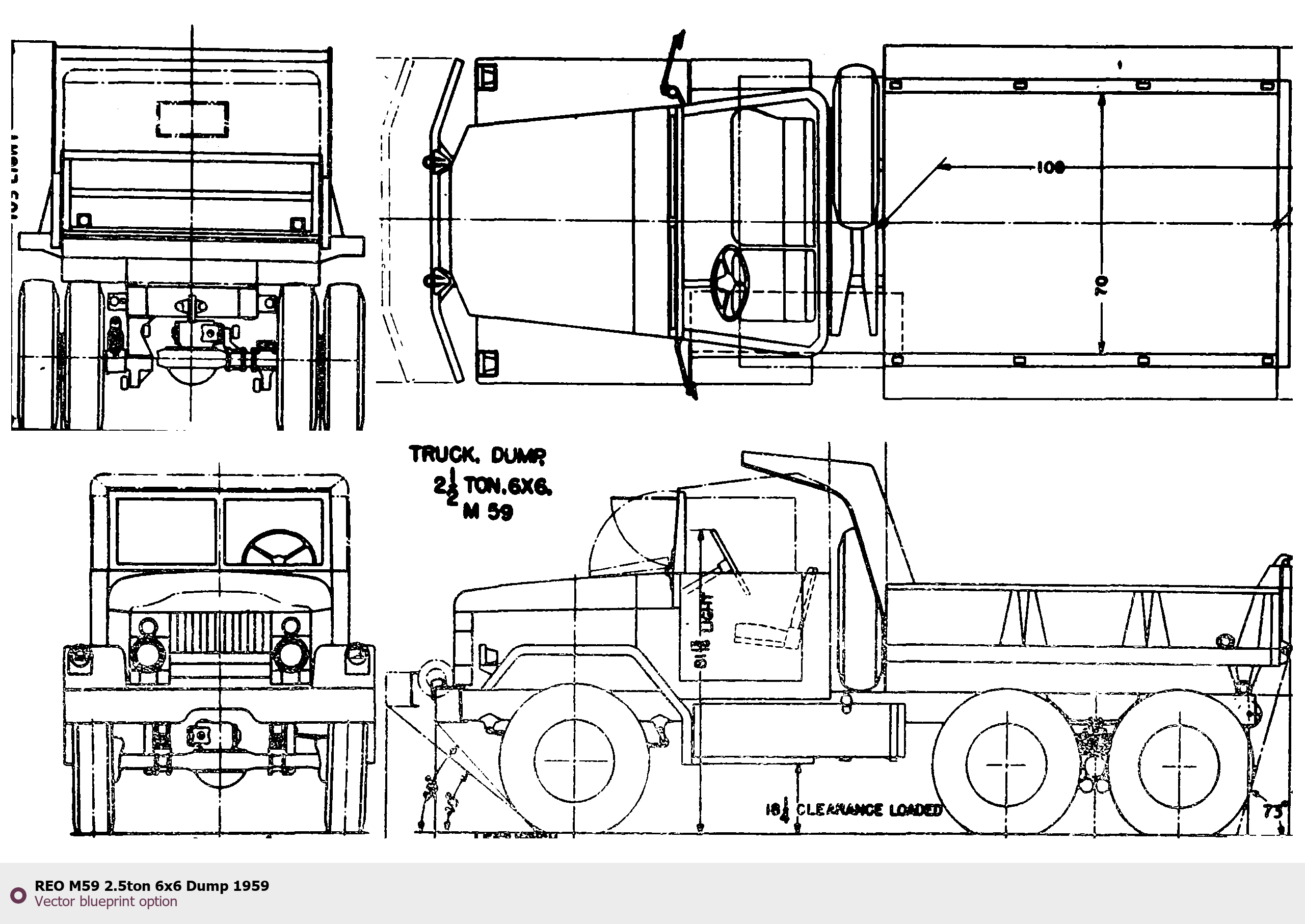 Raster blueprint of the 1959 REO M59 2.5ton 6x6 Dump Heavy Truck. This free downloadable image can be used for graphic projects, digital design, and 3D modeling. The file provides accurate exterior proportions of the vehicle. Model year: 1959. Body type: Heavy Truck.