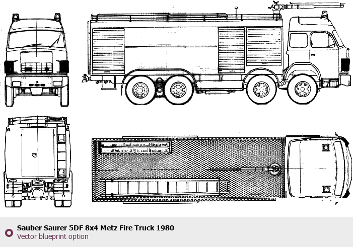 Raster blueprint of the 1980 Sauber Saurer 5DF 8x4 Metz Fire Truck Heavy Truck. This free downloadable image can be used for graphic projects, digital design, and 3D modeling. The file provides accurate exterior proportions of the vehicle. Model year: 1980. Body type: Heavy Truck.