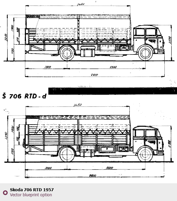 Raster blueprint of the 1957 Skoda 706 RTD Heavy Truck. This free downloadable image can be used for graphic projects, digital design, and 3D modeling. The file provides accurate exterior proportions of the vehicle. Model year: 1957. Body type: Heavy Truck.