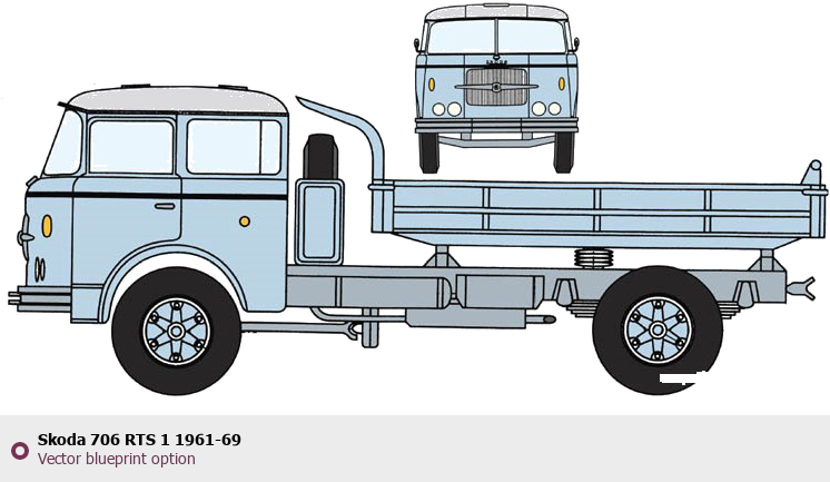 Raster blueprint of the Skoda 706 RTS 1 1961-69 Heavy Truck. This free downloadable image can be used for graphic projects, digital design, and 3D modeling. The file provides accurate exterior proportions of the vehicle. Body type: Heavy Truck.