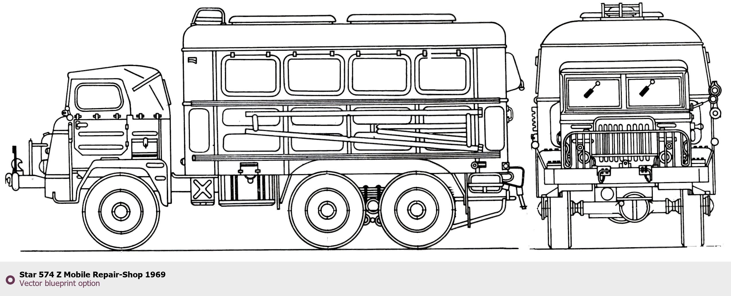 Raster blueprint of the 1969 Star 574 Z Mobile Repair-Shop Heavy Truck. This free downloadable image can be used for graphic projects, digital design, and 3D modeling. The file provides accurate exterior proportions of the vehicle. Model year: 1969. Body type: Heavy Truck.
