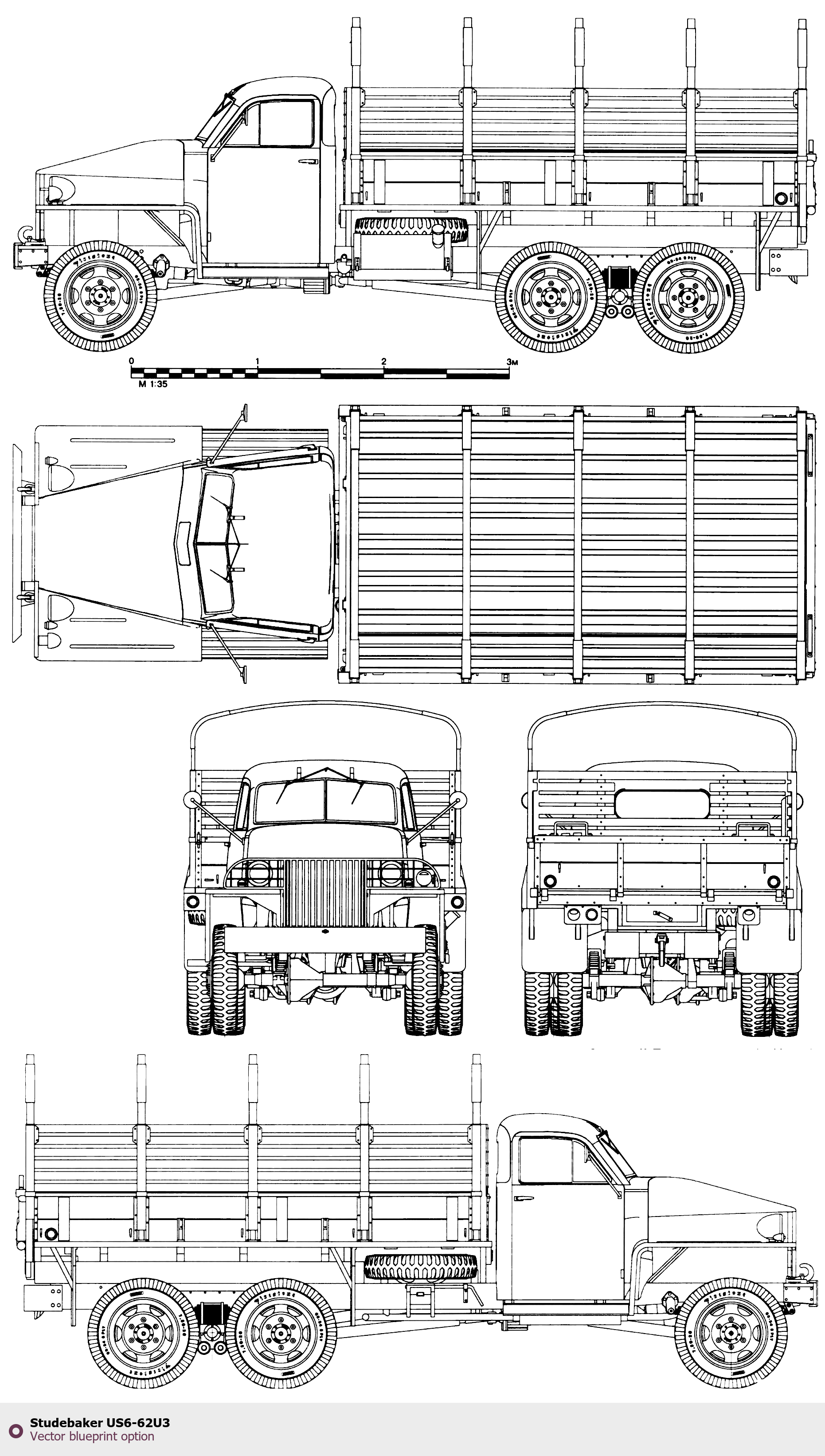 Raster blueprint of the Studebaker US6-62U3 Heavy Truck. This free downloadable image can be used for graphic projects, digital design, and 3D modeling. The file provides accurate exterior proportions of the vehicle. Body type: Heavy Truck.