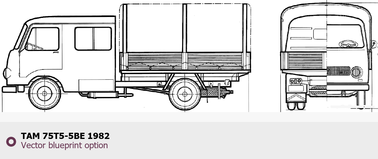 Raster blueprint of the 1982 TAM 75T5-5BE Heavy Truck. This free downloadable image can be used for graphic projects, digital design, and 3D modeling. The file provides accurate exterior proportions of the vehicle. Model year: 1982. Body type: Heavy Truck.