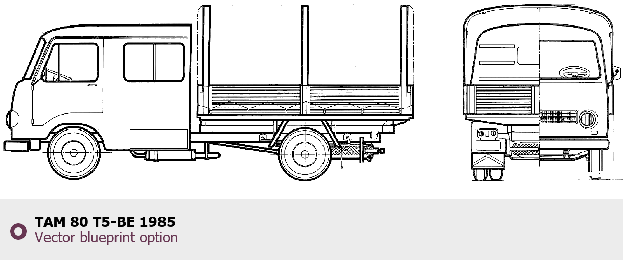Raster blueprint of the 1985 TAM 80 T5-BE Heavy Truck. This free downloadable image can be used for graphic projects, digital design, and 3D modeling. The file provides accurate exterior proportions of the vehicle. Model year: 1985. Body type: Heavy Truck.