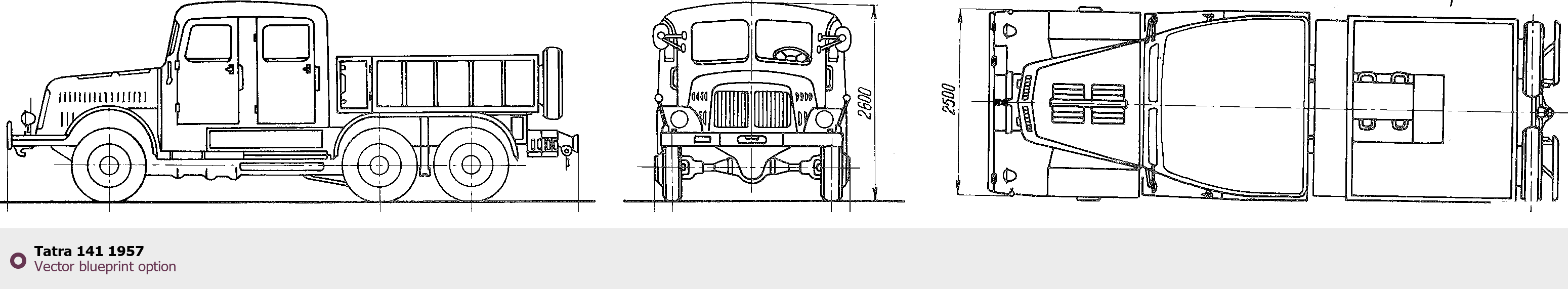 Raster blueprint of the 1957 Tatra 141 Heavy Truck. This free downloadable image can be used for graphic projects, digital design, and 3D modeling. The file provides accurate exterior proportions of the vehicle. Model year: 1957. Body type: Heavy Truck.