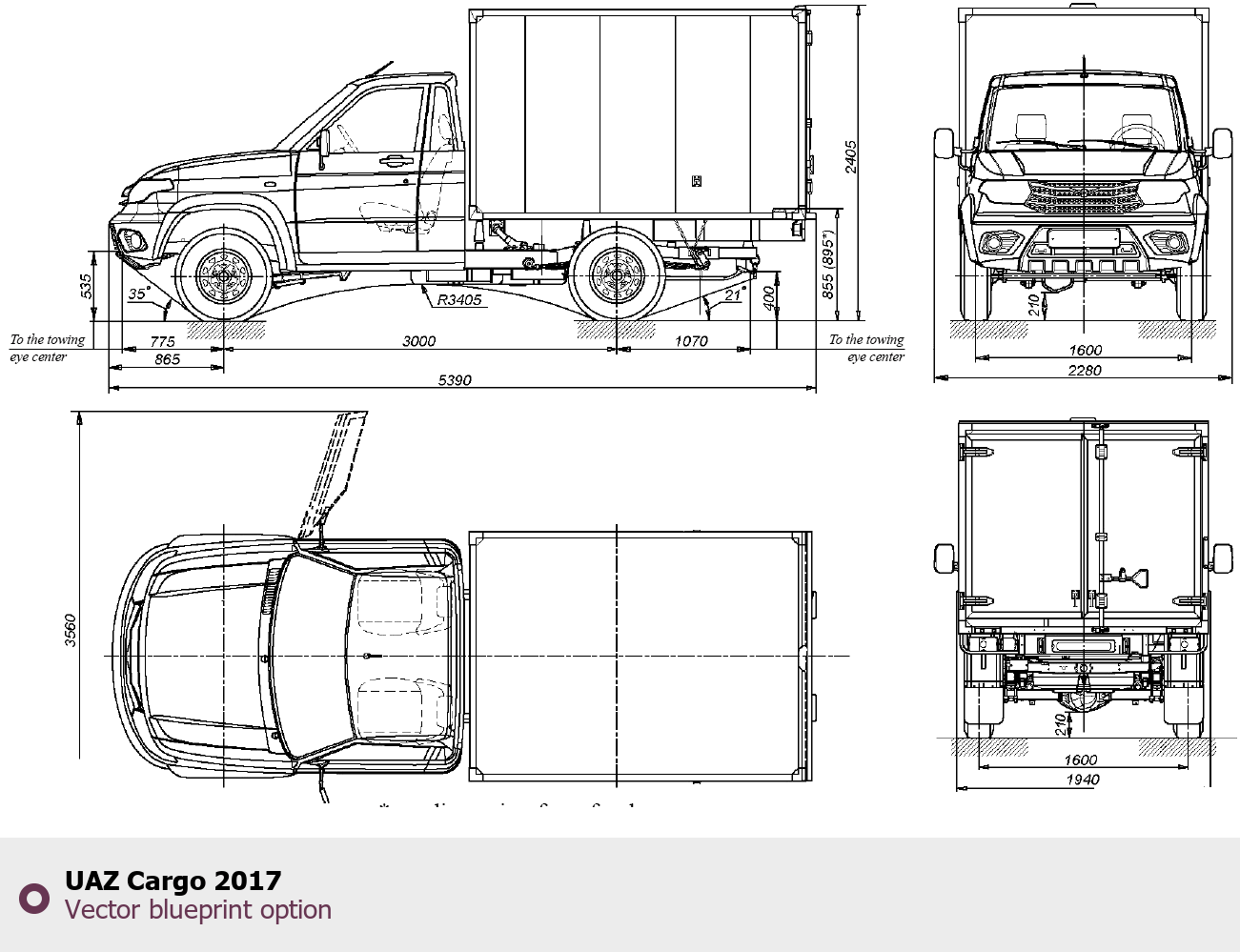 Raster blueprint of the 2017 UAZ Cargo SUV. This free downloadable image can be used for graphic projects, digital design, and 3D modeling. The file provides accurate exterior proportions of the vehicle. Model year: 2017. Body type: SUV.