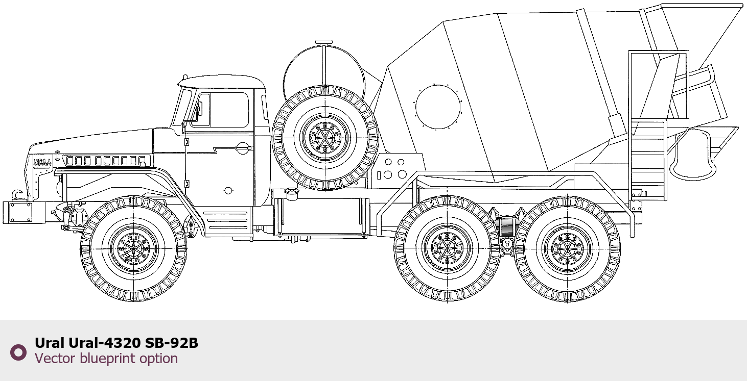Raster blueprint of the Ural Ural-4320 SB-92B Heavy Truck. This free downloadable image can be used for graphic projects, digital design, and 3D modeling. The file provides accurate exterior proportions of the vehicle. Body type: Heavy Truck.