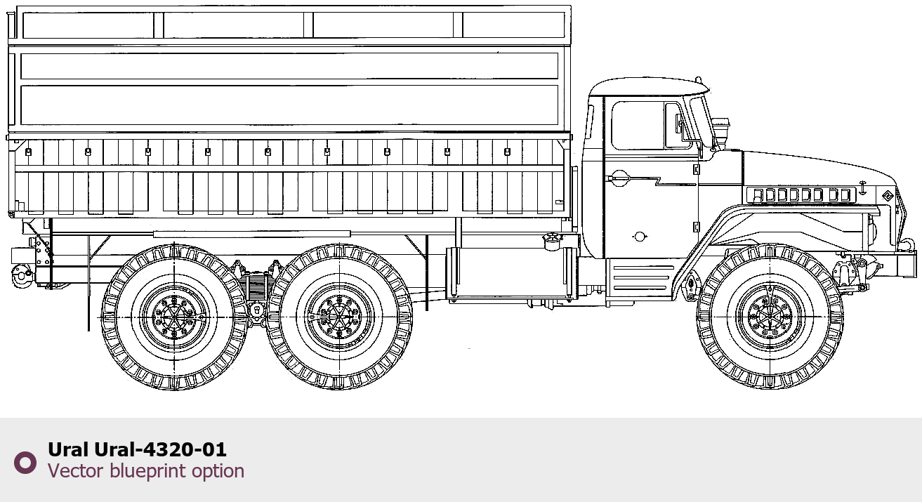 Raster blueprint of the Ural Ural-4320-01 Heavy Truck. This free downloadable image can be used for graphic projects, digital design, and 3D modeling. The file provides accurate exterior proportions of the vehicle. Body type: Heavy Truck.