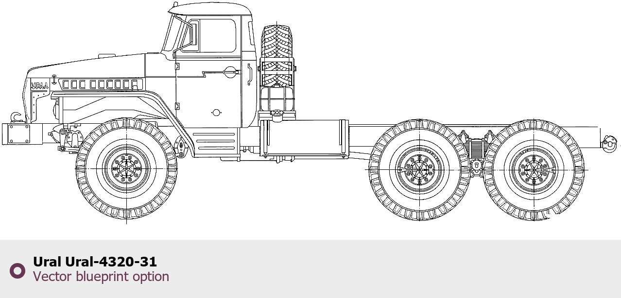 Raster blueprint of the Ural Ural-4320-31 Heavy Truck. This free downloadable image can be used for graphic projects, digital design, and 3D modeling. The file provides accurate exterior proportions of the vehicle. Body type: Heavy Truck.