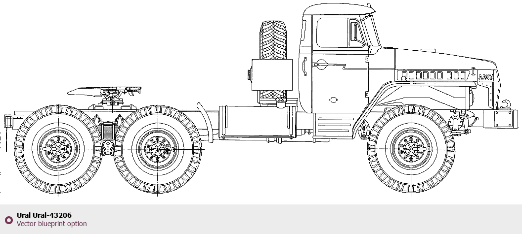 Raster blueprint of the Ural Ural-43206 Heavy Truck. This free downloadable image can be used for graphic projects, digital design, and 3D modeling. The file provides accurate exterior proportions of the vehicle. Body type: Heavy Truck.