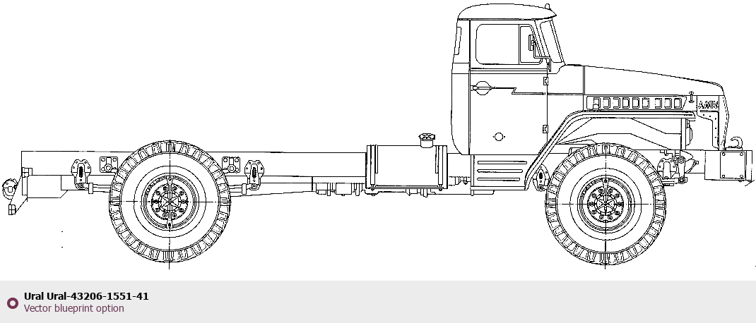 Raster blueprint of the Ural Ural-43206-1551-41 Heavy Truck. This free downloadable image can be used for graphic projects, digital design, and 3D modeling. The file provides accurate exterior proportions of the vehicle. Body type: Heavy Truck.