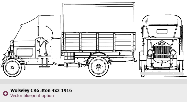 Raster blueprint of the 1916 Wolseley CR6 3ton 4x2 Heavy Truck. This free downloadable image can be used for graphic projects, digital design, and 3D modeling. The file provides accurate exterior proportions of the vehicle. Model year: 1916. Body type: Heavy Truck.