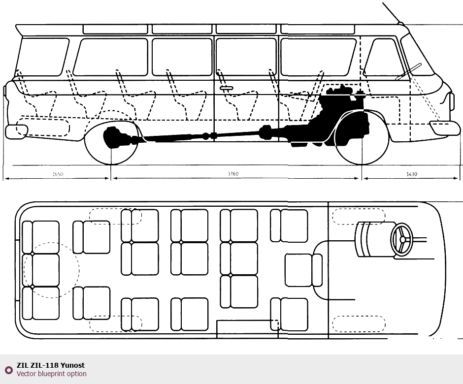Raster blueprint of the ZIL ZIL-118 Yunost Bus. This free downloadable image can be used for graphic projects, digital design, and 3D modeling. The file provides accurate exterior proportions of the vehicle. Body type: Bus.