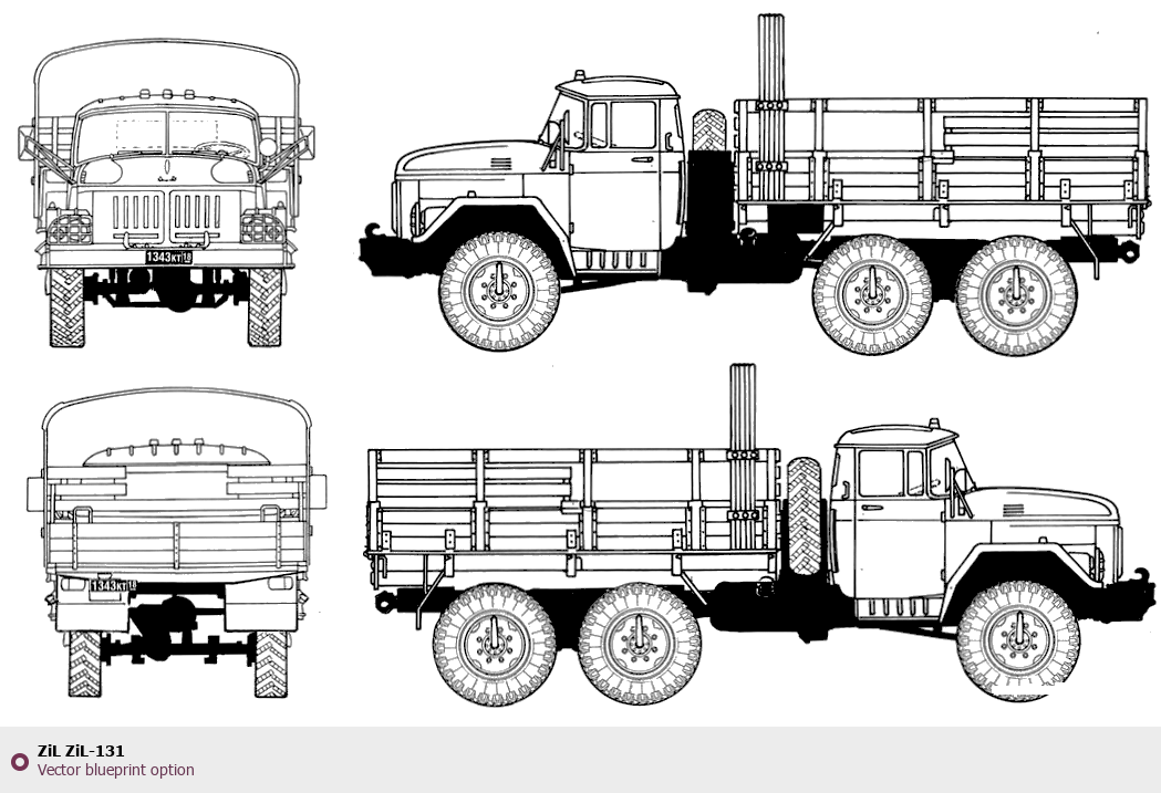 Raster blueprint of the ZIL ZiL-131 Heavy Truck. This free downloadable image can be used for graphic projects, digital design, and 3D modeling. The file provides accurate exterior proportions of the vehicle. Body type: Heavy Truck.