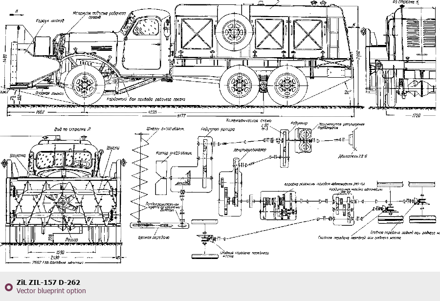 Raster blueprint of the ZIL ZIL-157 D-262 Heavy Truck. This free downloadable image can be used for graphic projects, digital design, and 3D modeling. The file provides accurate exterior proportions of the vehicle. Body type: Heavy Truck.