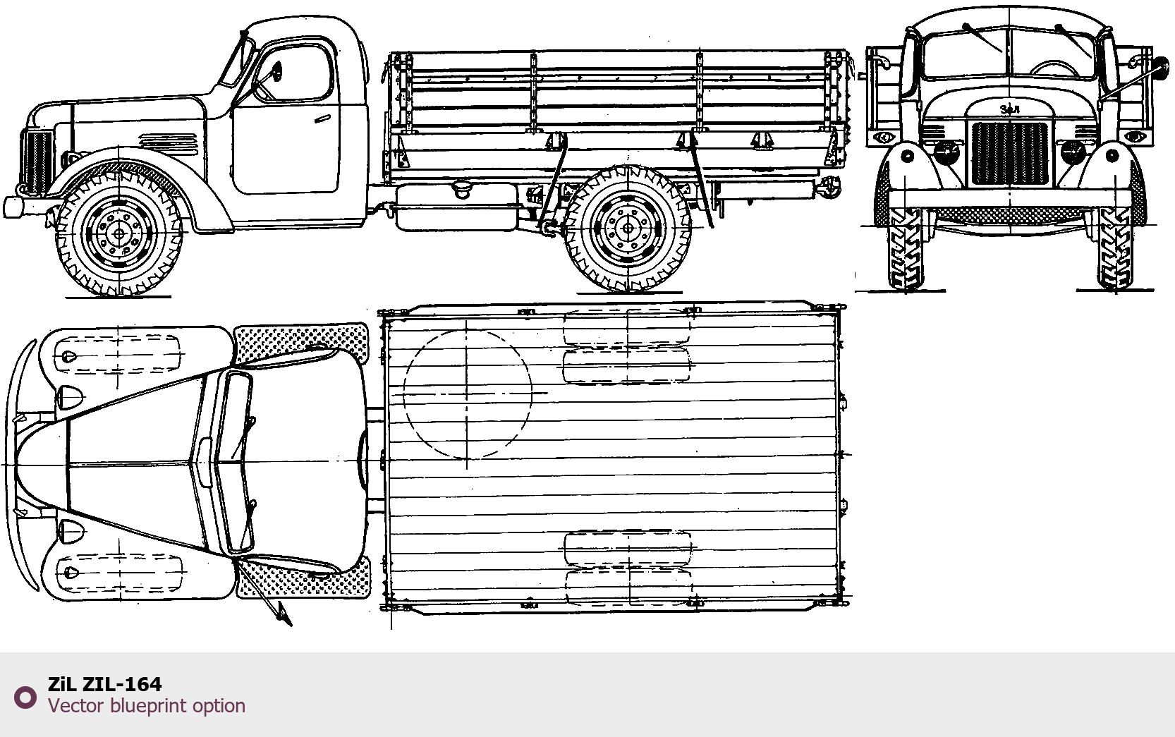 Raster blueprint of the ZIL ZIL-164 Heavy Truck. This free downloadable image can be used for graphic projects, digital design, and 3D modeling. The file provides accurate exterior proportions of the vehicle. Body type: Heavy Truck.