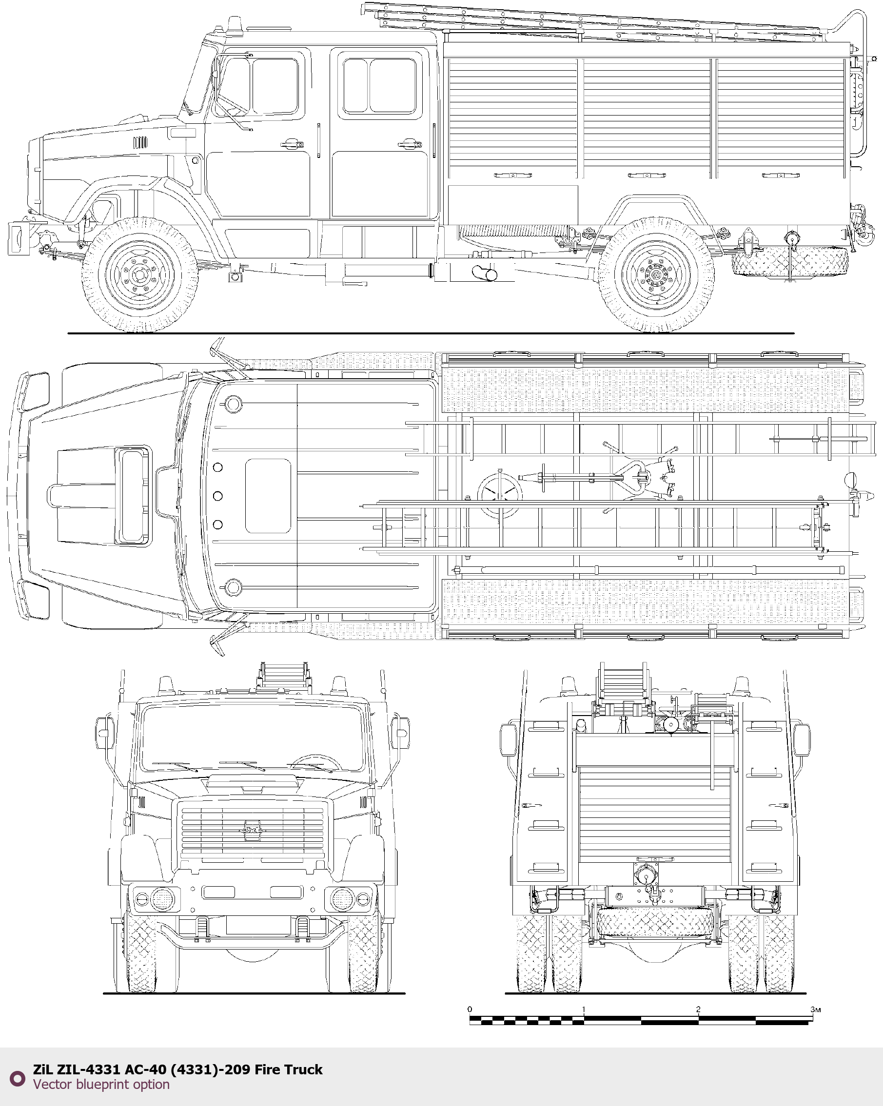 Raster blueprint of the ZIL ZIL-4331 AC-40 (4331)-209 Fire Truck Heavy Truck. This free downloadable image can be used for graphic projects, digital design, and 3D modeling. The file provides accurate exterior proportions of the vehicle. Body type: Heavy Truck.