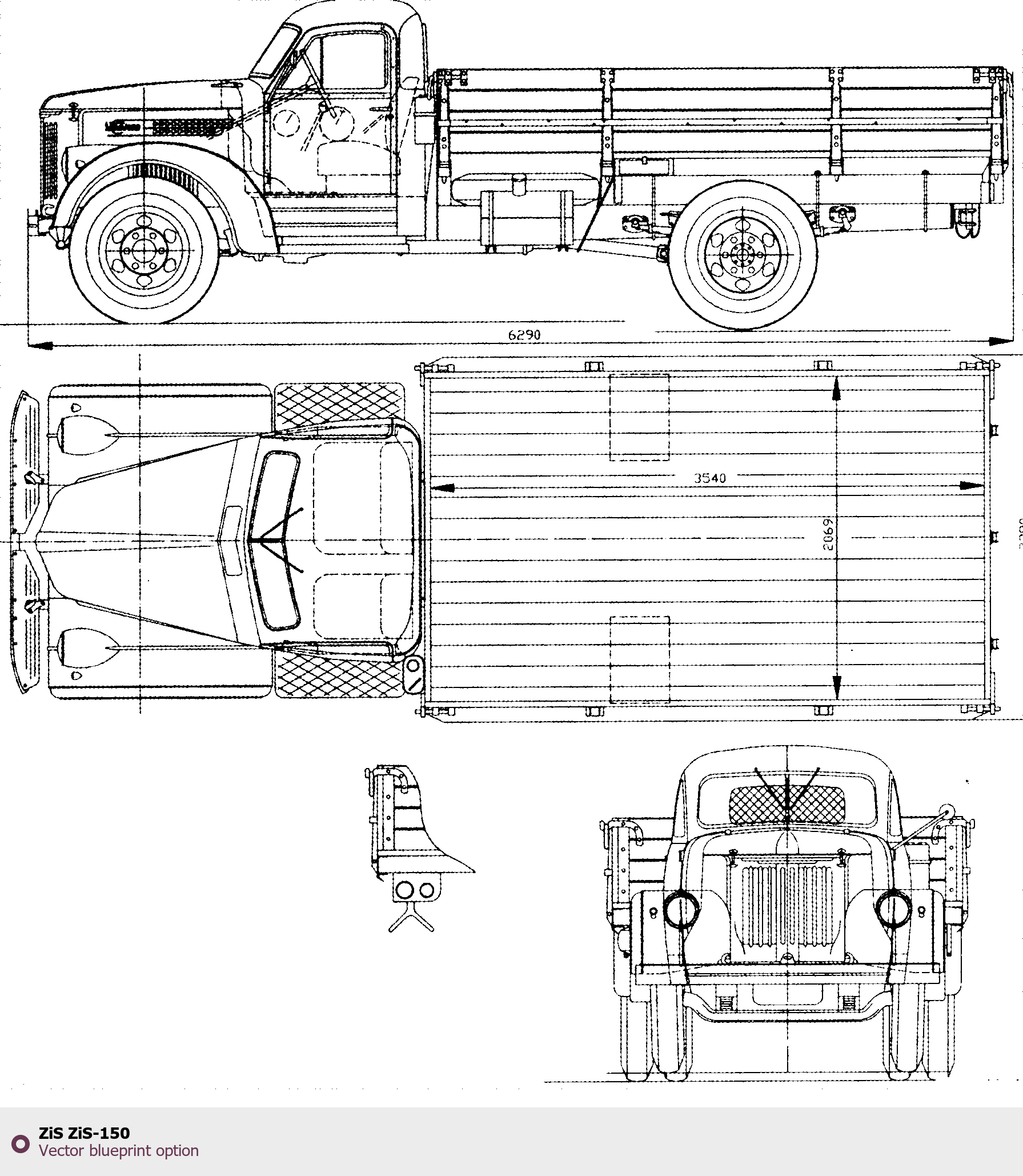 Raster blueprint of the ZIS ZiS-150 Heavy Truck. This free downloadable image can be used for graphic projects, digital design, and 3D modeling. The file provides accurate exterior proportions of the vehicle. Body type: Heavy Truck.