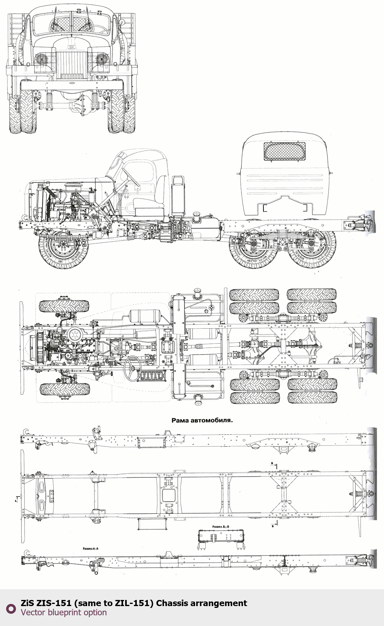 Raster blueprint of the ZIS ZIS-151 (same to ZIL-151) Chassis arrangement Heavy Truck. This free downloadable image can be used for graphic projects, digital design, and 3D modeling. The file provides accurate exterior proportions of the vehicle. Body type: Heavy Truck.