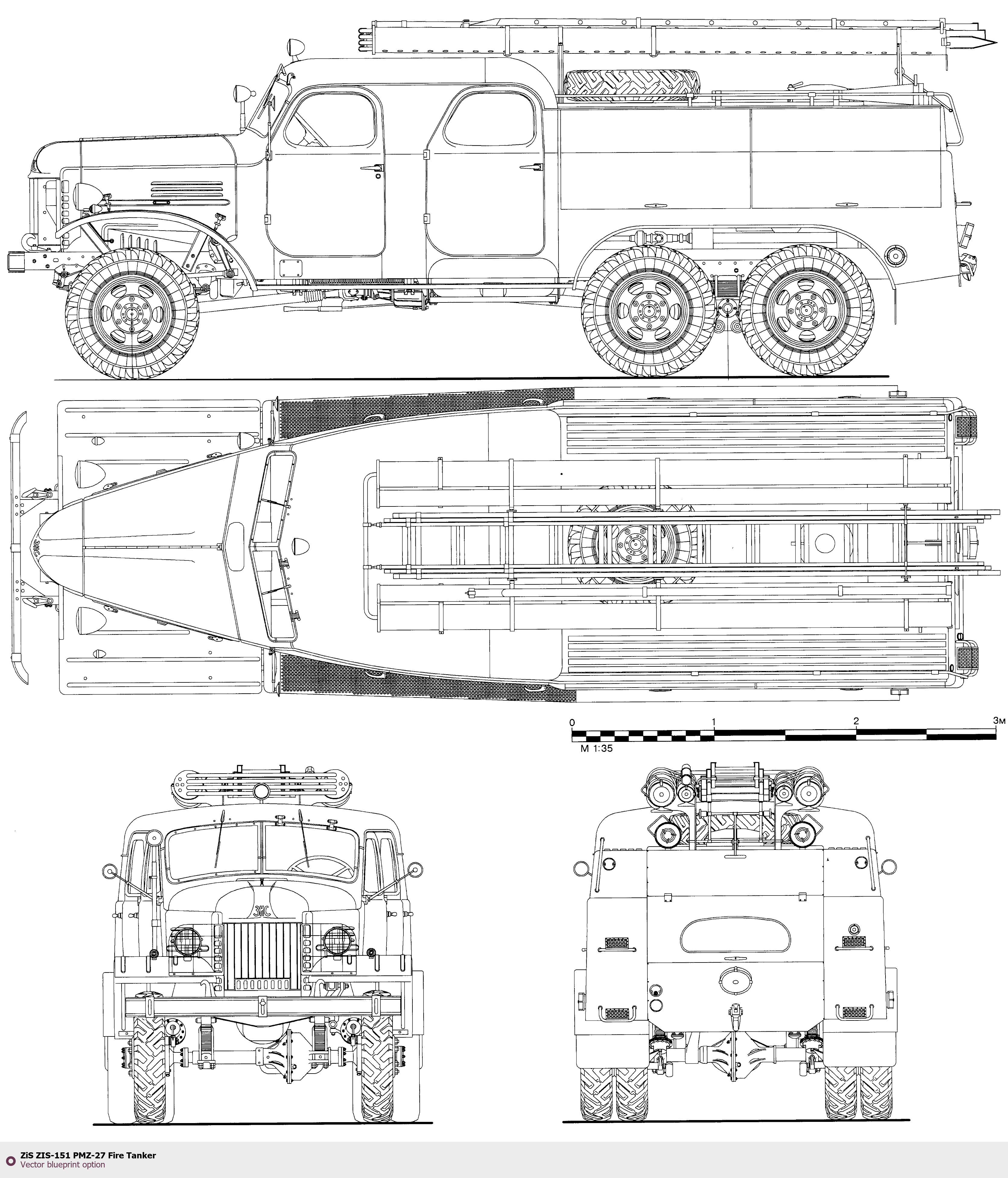 Raster blueprint of the ZIS ZIS-151 PMZ-27 Fire Tanker Heavy Truck. This free downloadable image can be used for graphic projects, digital design, and 3D modeling. The file provides accurate exterior proportions of the vehicle. Body type: Heavy Truck.