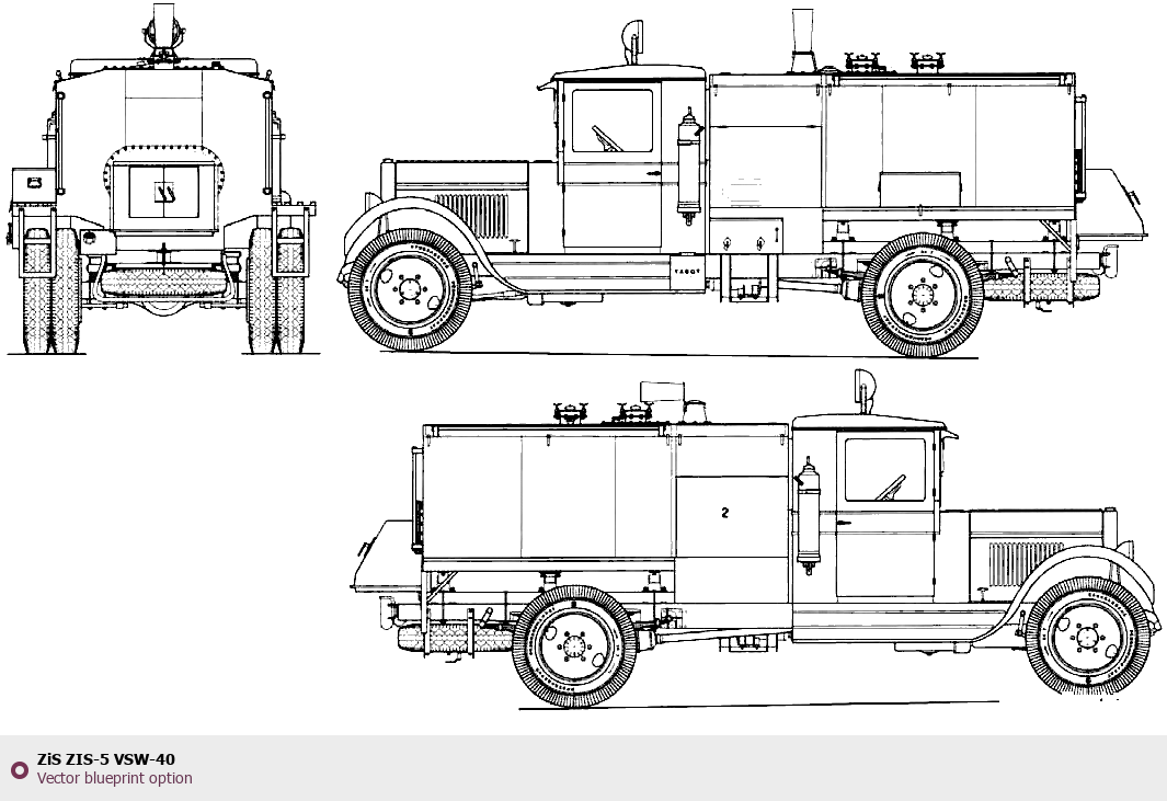 Raster blueprint of the ZIS ZIS-5 VSW-40 Heavy Truck. This free downloadable image can be used for graphic projects, digital design, and 3D modeling. The file provides accurate exterior proportions of the vehicle. Body type: Heavy Truck.