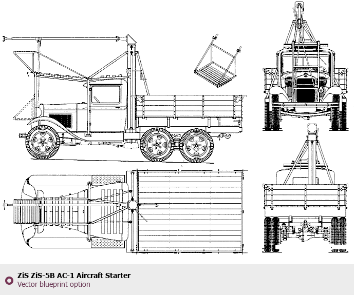 Raster blueprint of the ZIS ZiS-5B AC-1 Aircraft Starter Heavy Truck. This free downloadable image can be used for graphic projects, digital design, and 3D modeling. The file provides accurate exterior proportions of the vehicle. Body type: Heavy Truck.