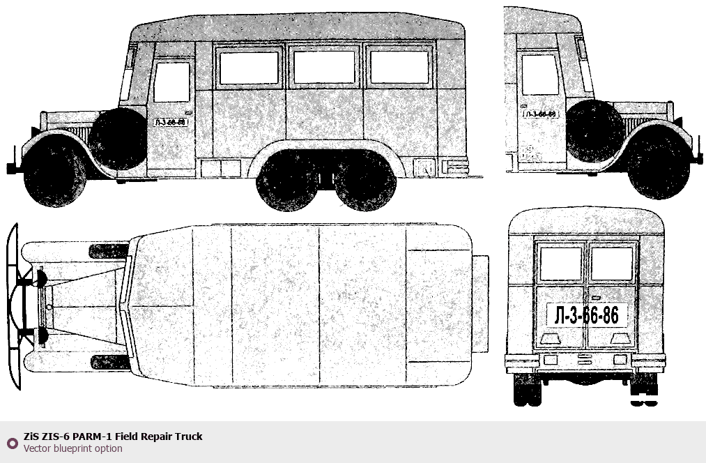 Raster blueprint of the ZIS ZIS-6 PARM-1 Field Repair Truck Heavy Truck. This free downloadable image can be used for graphic projects, digital design, and 3D modeling. The file provides accurate exterior proportions of the vehicle. Body type: Heavy Truck.