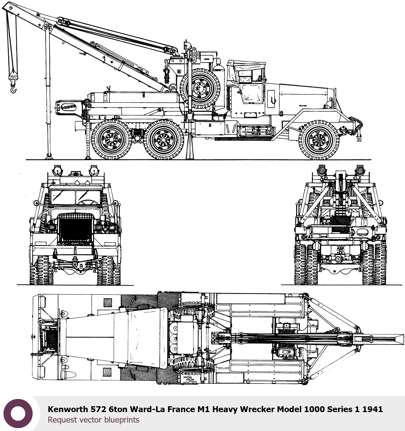 Raster blueprint of the 1941 Kenworth 572 6ton Ward-La France M1 Heavy Wrecker 1000 Series 1 Heavy Truck. This free downloadable image can be used for graphic projects, digital design, and 3D modeling. The file provides accurate exterior proportions of the vehicle. Model year: 1941. Body type: Heavy Truck.