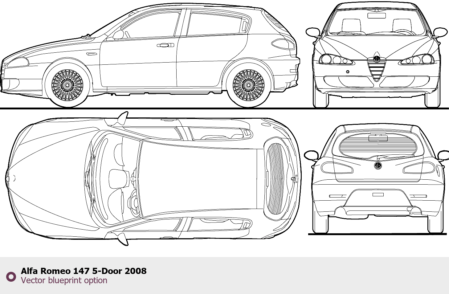 Raster blueprint of the 2008 Alfa Romeo 147 5-Door Hatchback. This free downloadable image can be used for graphic projects, digital design, and 3D modeling. The file provides accurate exterior proportions of the vehicle. Model year: 2008. Body type: Hatchback.