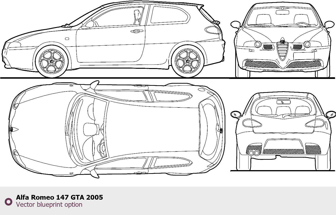 Raster blueprint of the 2005 Alfa Romeo 147 GTA Hatchback. This free downloadable image can be used for graphic projects, digital design, and 3D modeling. The file provides accurate exterior proportions of the vehicle. Model year: 2005. Body type: Hatchback.