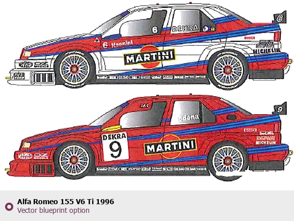 Raster blueprint of the 1996 Alfa Romeo 155 V6 Ti Sedan. This free downloadable image can be used for graphic projects, digital design, and 3D modeling. The file provides accurate exterior proportions of the vehicle. Model year: 1996. Body type: Sedan.
