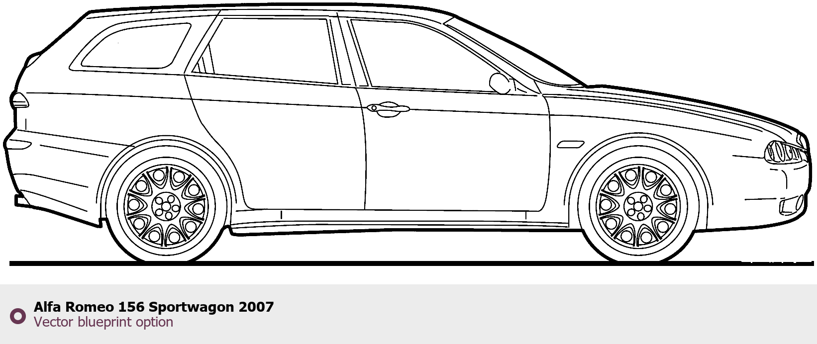 Raster blueprint of the 2007 Alfa Romeo 156 Sportwagon Tag. This free downloadable image can be used for graphic projects, digital design, and 3D modeling. The file provides accurate exterior proportions of the vehicle. Model year: 2007. Body type: Tag.