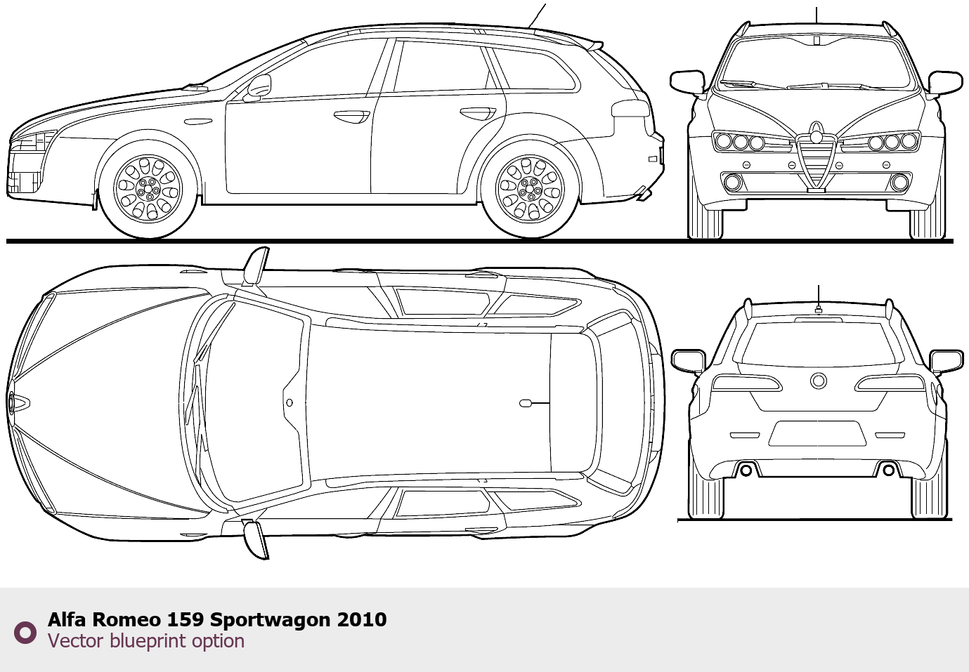 Raster blueprint of the 2010 Alfa Romeo 159 Sportwagon Tag. This free downloadable image can be used for graphic projects, digital design, and 3D modeling. The file provides accurate exterior proportions of the vehicle. Model year: 2010. Body type: Tag.