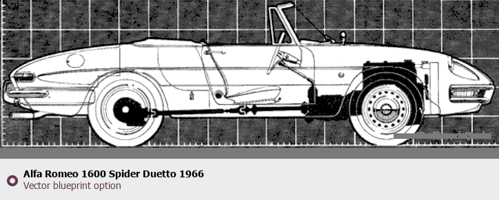 Raster blueprint of the 1966 Alfa Romeo 1600 Spider Duetto Roadster. This free downloadable image can be used for graphic projects, digital design, and 3D modeling. The file provides accurate exterior proportions of the vehicle. Model year: 1966. Body type: Roadster.